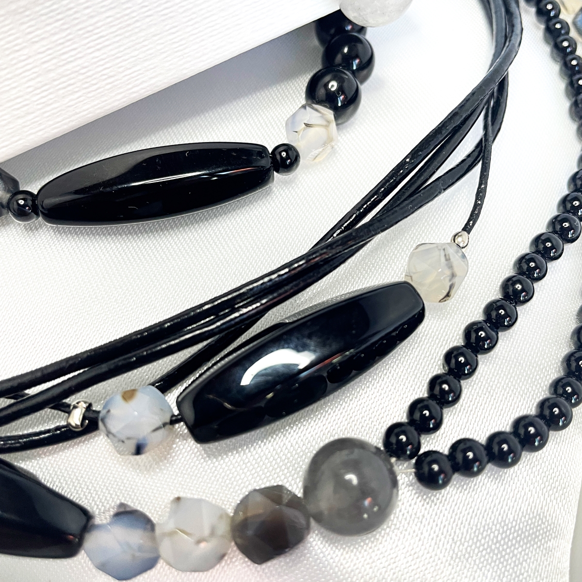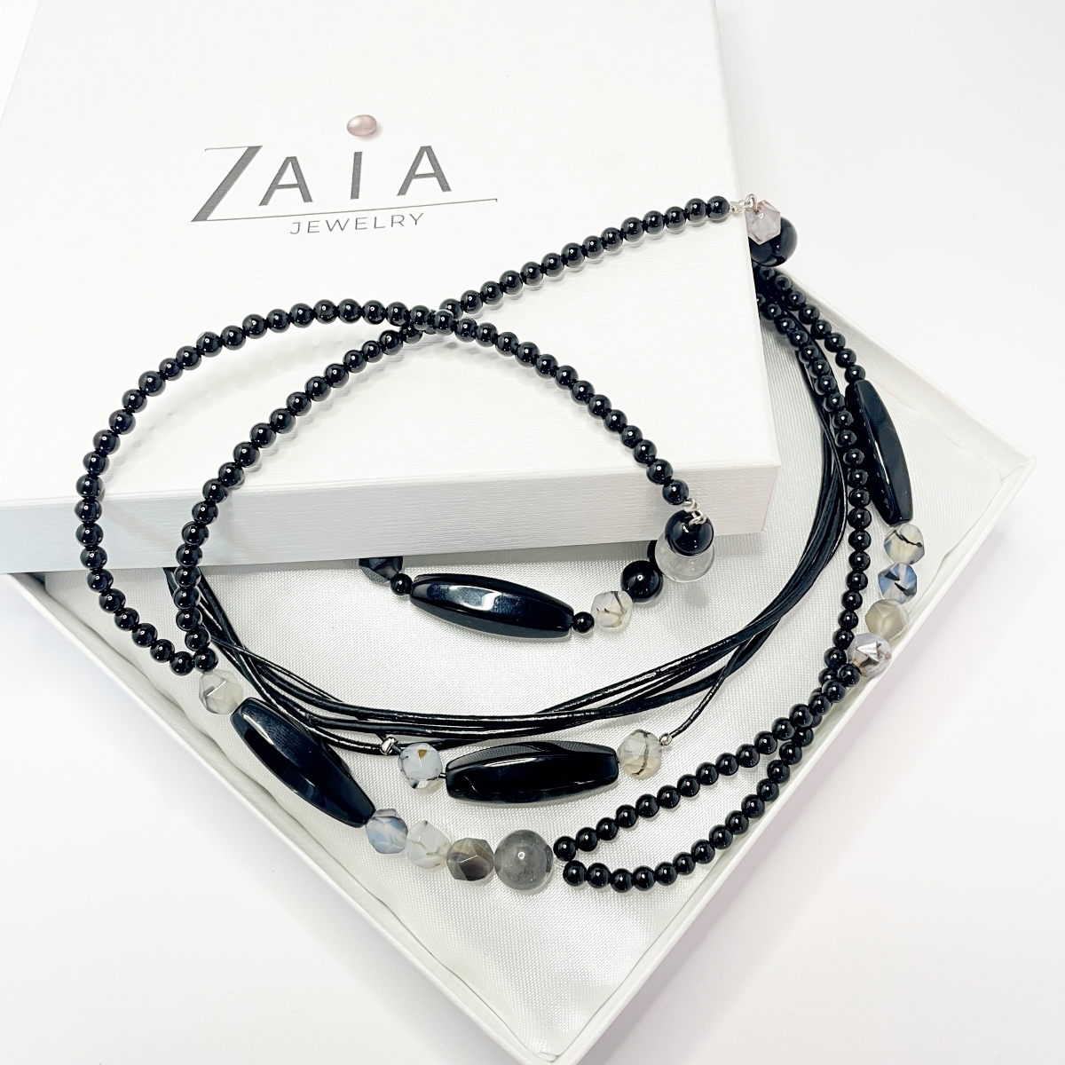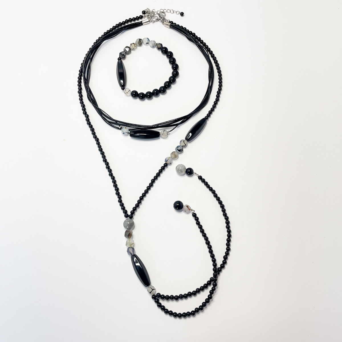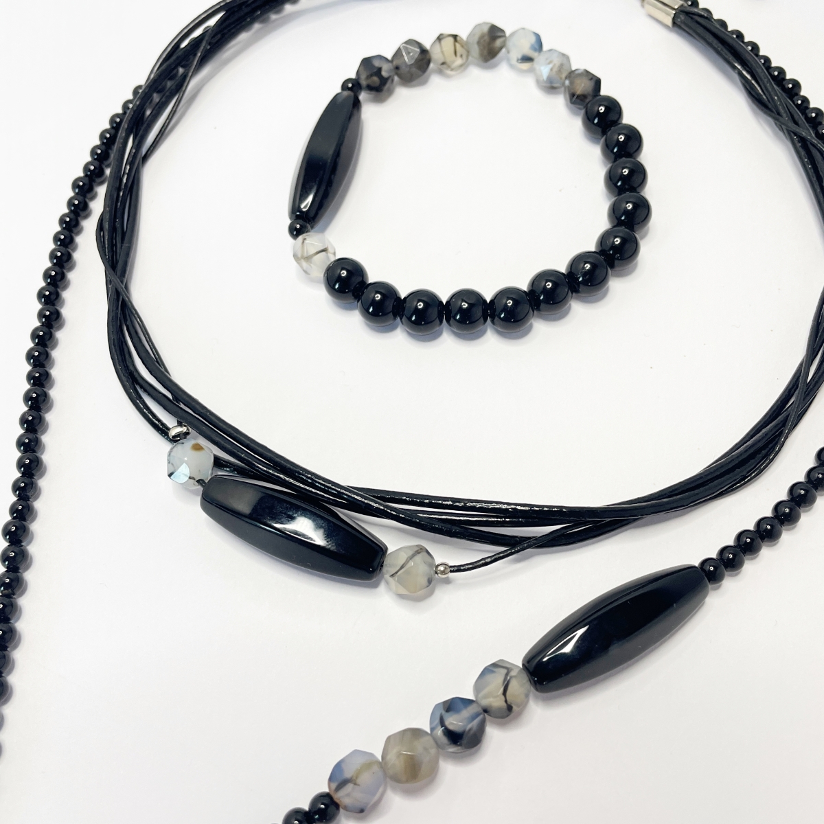 Három darabból álló ékszer szett. A rövid és hosszú nyaklánc dögös összhatását a karkötő teszi teljessé. Bőr és gyöngysor, szürke és fekete. Jól kombinálható nőies darab. A fekete achátok gyönyörűen kiemelik a szürke rajzolatos csiszolt köveket. Szürkével, feketével, krémszínnel, fehérrel párosítva verhetetlen. Elegáns és laza ruhához egyaránt remek viselet.