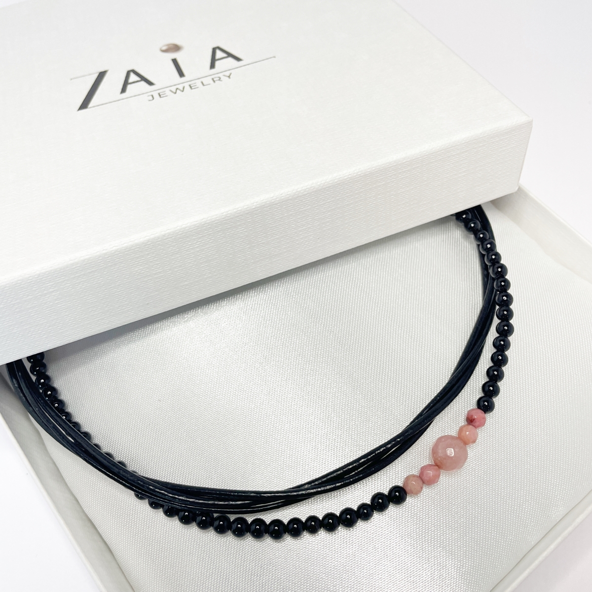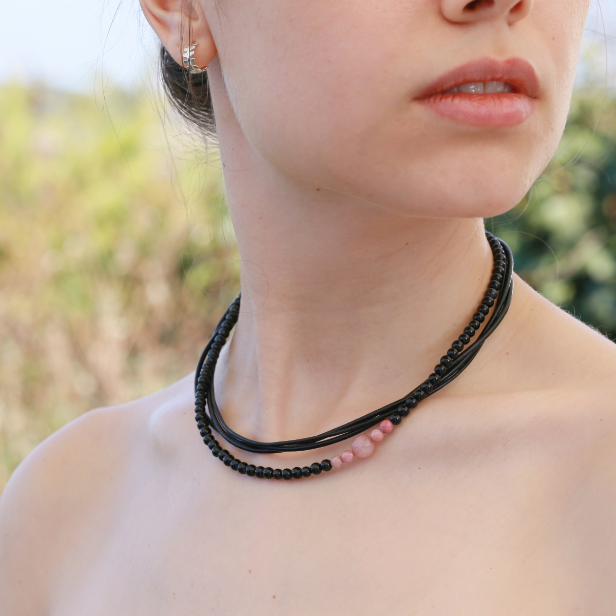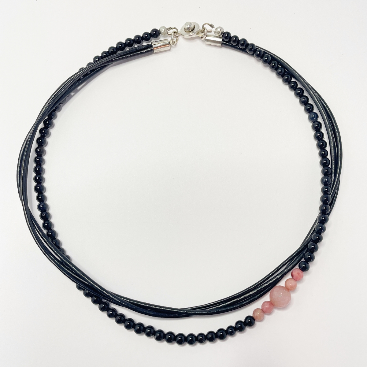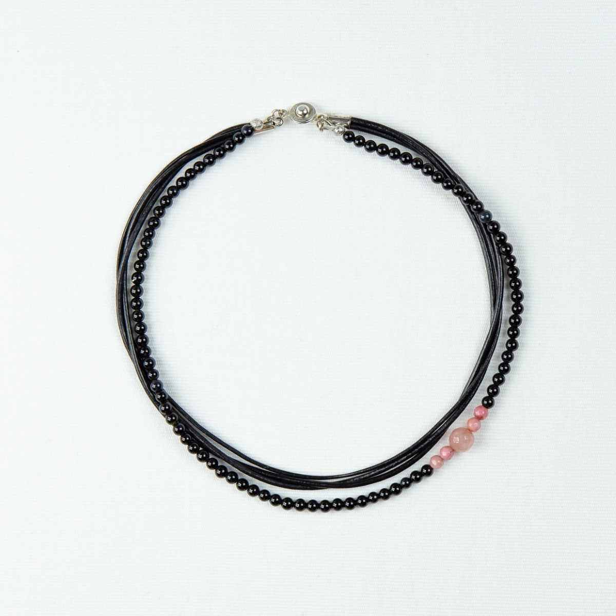 Bőr ékszer ásvány nyaklánc. Bőr és gyöngysor. Vagányság és romantika. Ez teszi ellenállhatatlanul bájossá ezt az ásvány nyakláncot. A fekete 4mm-es achátok határozottságát megszelídíti a rózsaszín jáde és rodokrozit finomsága, nőiessége. Elegáns, dögös és finom darab egyben.