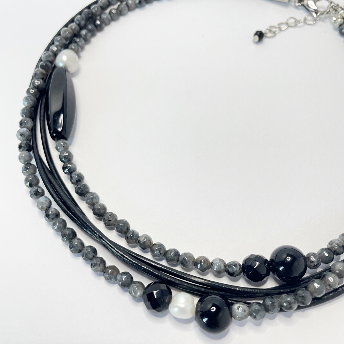 | Material | Black agate, black leather, Labradorite, True pearl |