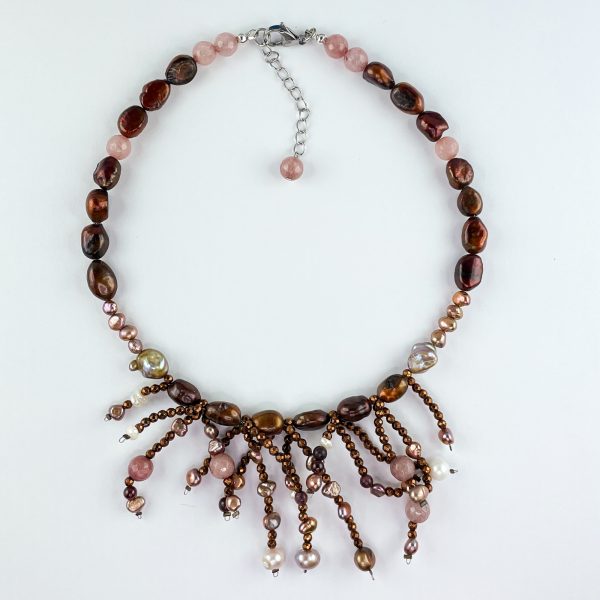 True pearl hematite necklace. A real specialty is true pearl variations, hematite and jade stones. Extremely spectacular jewelry, its extravagant form is accompanied by a beautiful world of colors. The subtle interplay of shades of brown, gold and pink makes it irresistible. From jeans to evening dresses, a hit for everything.
